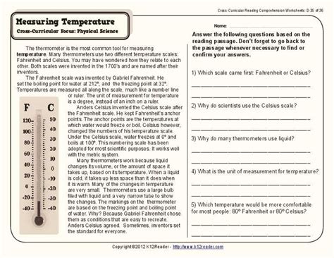 A thermometer is an instrument that measures temperature. There are many types of thermometers, ranging from liquid-in-glass thermometers to digital thermometers. For the Temperature and Its Measurement Worksheet Answers, you will likely need to use a liquid-in-glass thermometer, which consists of a glass tube filled with a liquid that expands or contracts as the temperature changes.
